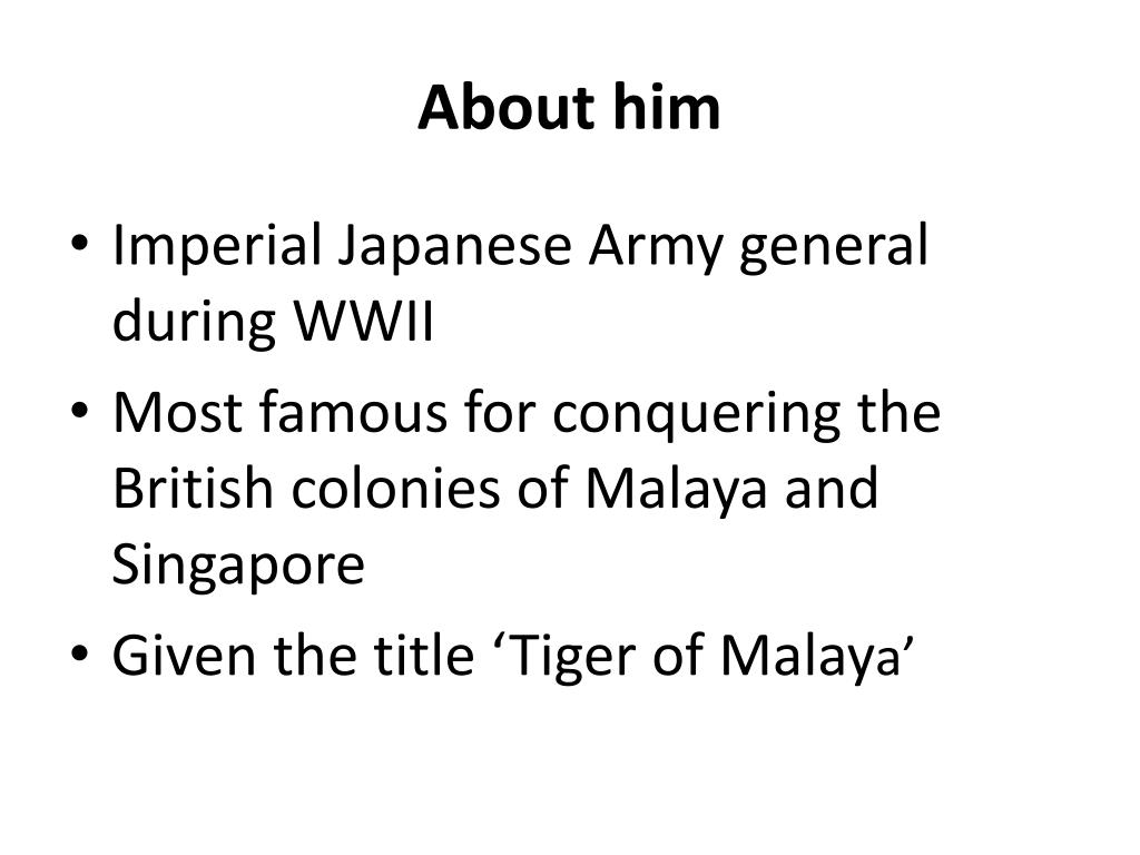 About him • Imperial Japanese Army general during WWII • Most famous for conquering the British colonies of Malaya and Singapore • Given the title ‘Tiger of Malaya’
