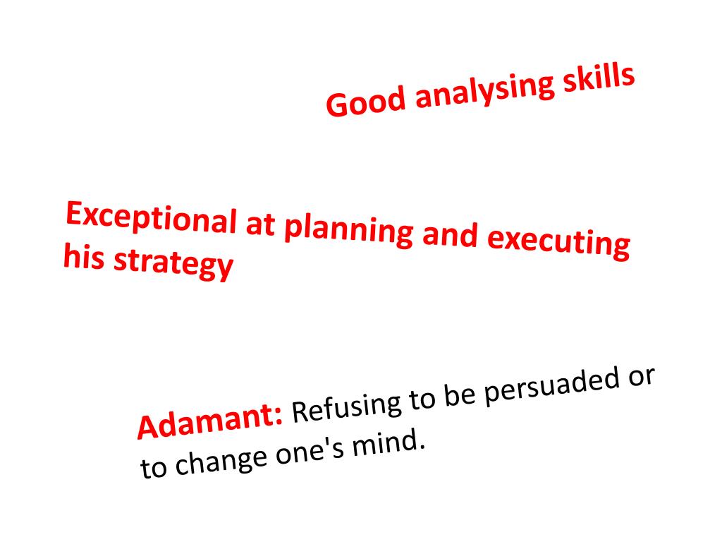 Good analysing skills Exceptional at planning and executing his strategy Adamant: Refusing to be persuaded or to change one's mind.