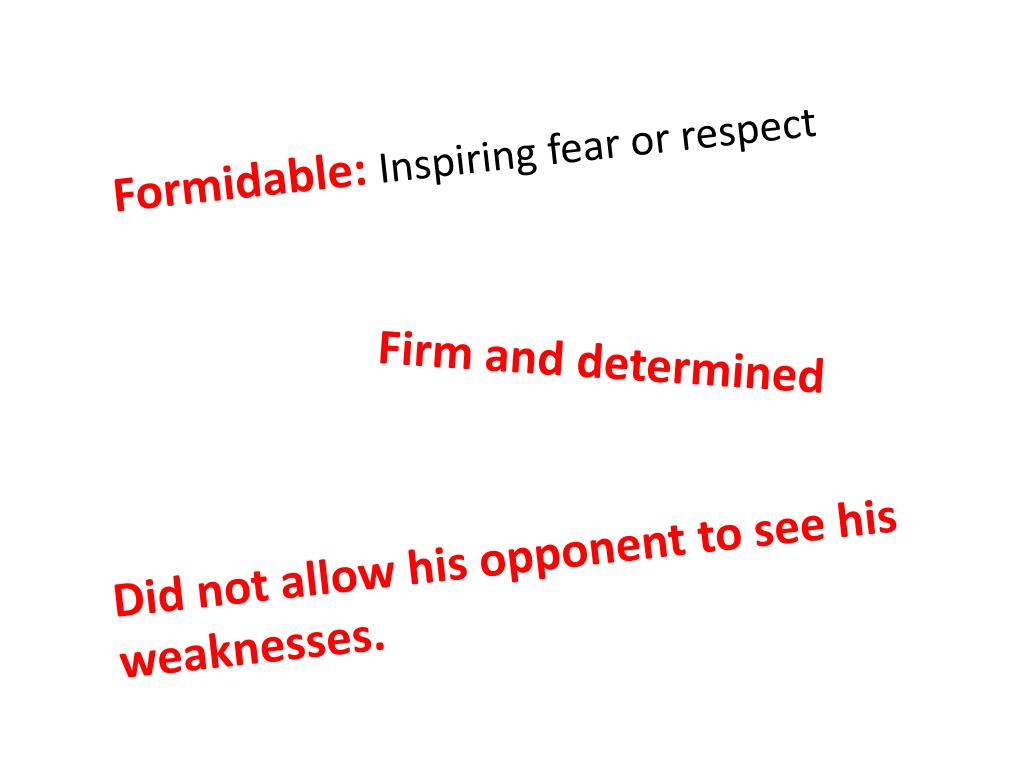Formidable: Inspiring fear or respect Firm and determined Did not allow his opponent to see his weaknesses.