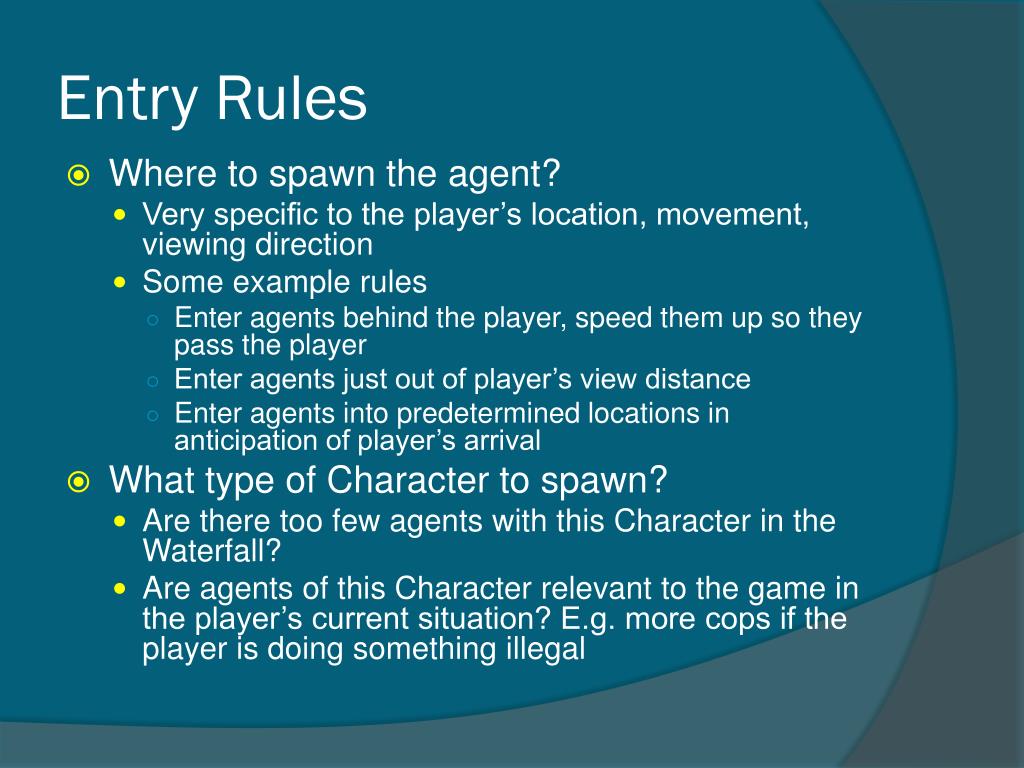 Entry Rules • Where to spawn the agent? • Very specific to the player’s location, movement, viewing direction • Some example rules • Enter agents behind the player, speed them up so they pass the player • Enter agents just out of player’s view distance • Enter agents into predetermined locations in anticipation of player’s arrival • What type of Character to spawn? • Are there too few agents with this Character in the Waterfall? • Are agents of this Character relevant to the game in the player’s current situation? E.g. more cops if the player is doing something illegal