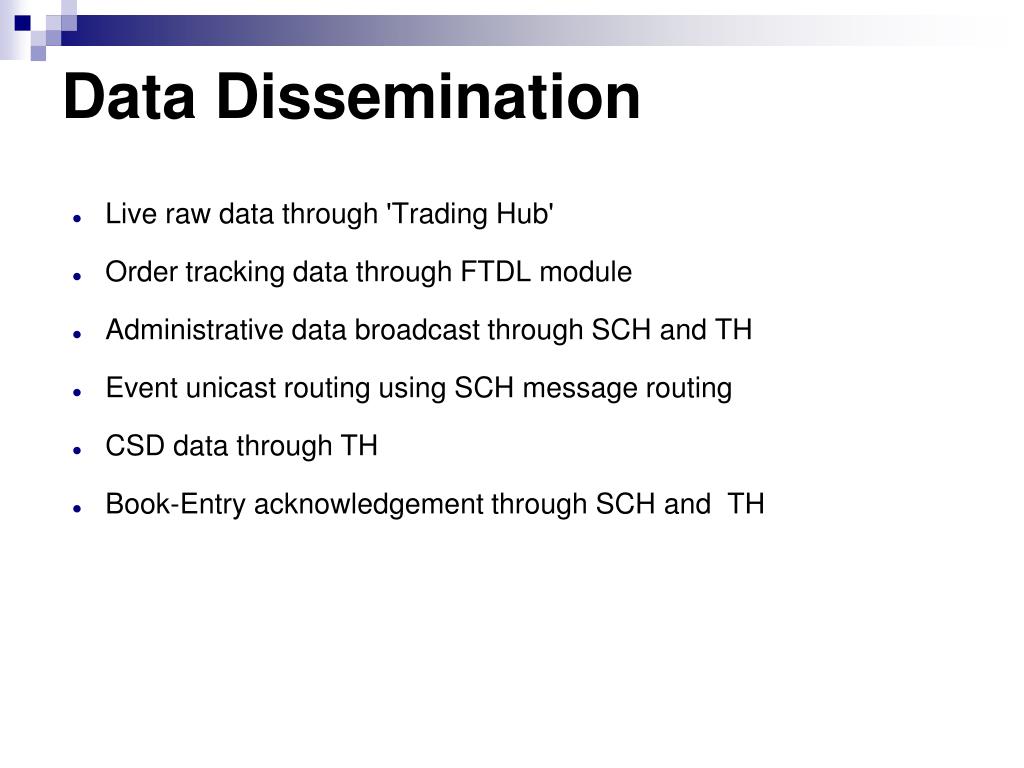 Data Dissemination • Live raw data through 'Trading Hub' • Order tracking data through FTDL module • Administrative data broadcast through SCH and TH • Event unicast routing using SCH message routing • CSD data through TH • Book-Entry acknowledgement through SCH and TH