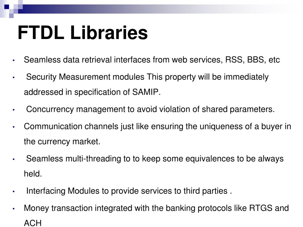 FTDL Libraries • Seamless data retrieval interfaces from web services, RSS, BBS, etc • Security Measurement modules This property will be immediately addressed in specification of SAMIP. • Concurrency management to avoid violation of shared parameters. • Communication channels just like ensuring the uniqueness of a buyer in the currency market. • Seamless multi-threading to to keep some equivalences to be always held. • Interfacing Modules to provide services to third parties . • Money transaction integrated with the banking protocols like RTGS and ACH