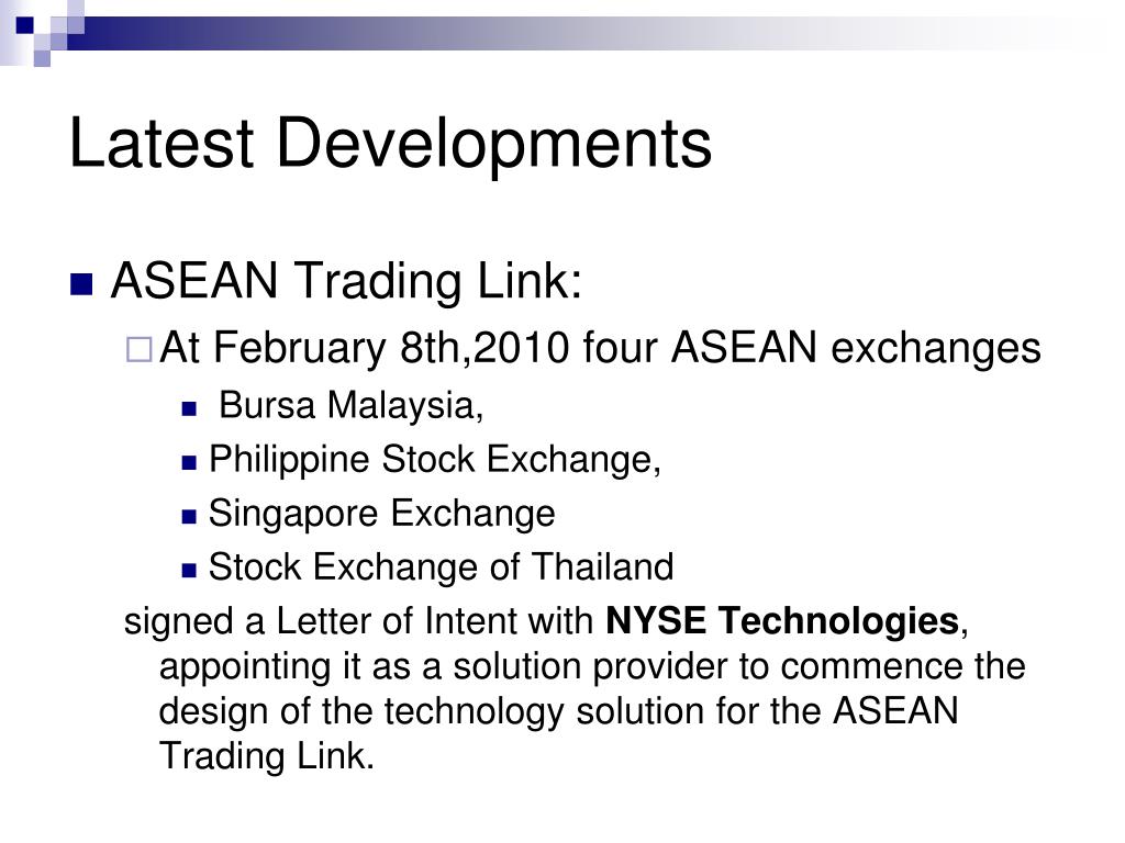 Latest Developments • ASEAN Trading Link: • At February 8th,2010 four ASEAN exchanges • Bursa Malaysia, • Philippine Stock Exchange, • Singapore Exchange • Stock Exchange of Thailand signed a Letter of Intent with NYSE Technologies, appointing it as a solution provider to commence the design of the technology solution for the ASEAN Trading Link.