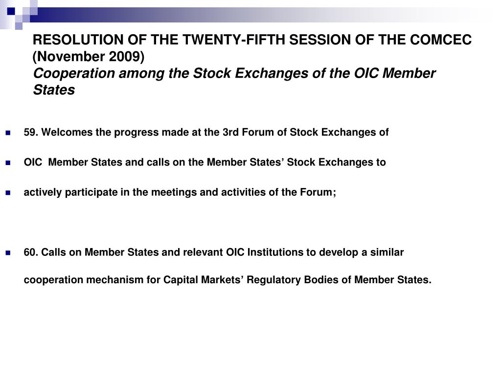 59. Welcomes the progress made at the 3rd Forum of Stock Exchanges of OIC Member States and calls on the Member States’ Stock Exchanges to actively participate in the meetings and activities of the Forum; 60. Calls on Member States and relevant OIC Institutions to develop a similar cooperation mechanism for Capital Markets’ Regulatory Bodies of Member States. RESOLUTION OF THE TWENTY-FIFTH SESSION OF THE COMCEC(November 2009)Cooperation among the Stock Exchanges of the OIC Member States