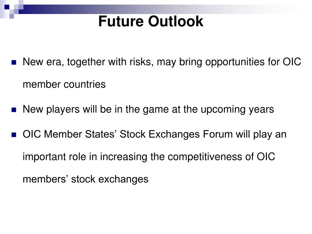 Future Outlook • New era, together with risks, may bring opportunities for OIC member countries • New players will be in the game at the upcoming years • OIC Member States’ Stock Exchanges Forum will play an important role in increasing the competitiveness of OIC members’ stock exchanges