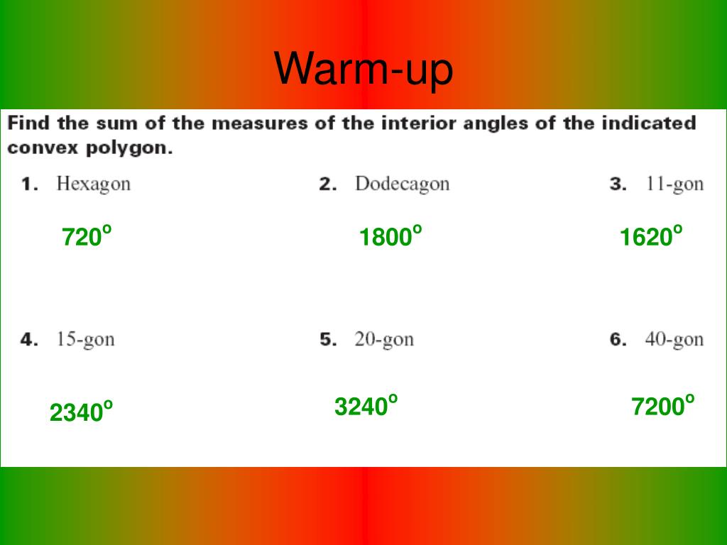 Warm-up. 720 o. 1800 o. 1620 o. 3240 o. 7200 o. 2340 o. 8.1 Find Angle Measures in Polygons. Open your packets page 200!. 360 o. 360 o. 89 o. 2x o. 85 o. 360 o. 3. 174 o. 360 o. 93 o. 2. 180 o. 15. 2. 180 o. 2340 o. 15. 2340 o. 15. 2340 o. 15. 156 o. 156 o. 360 o.