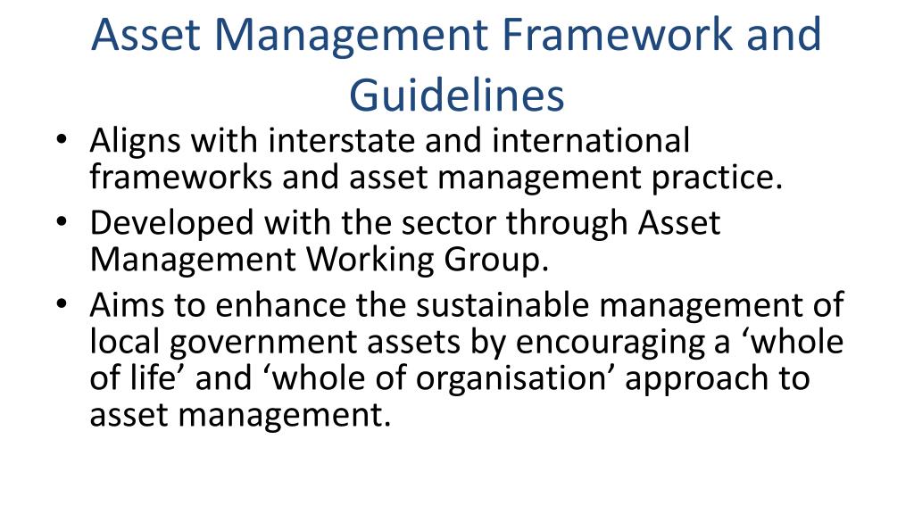 Asset Management Framework and Guidelines • Aligns with interstate and international frameworks and asset management practice. • Developed with the sector through Asset Management Working Group. • Aims to enhance the sustainable management of local government assets by encouraging a ‘whole of life’ and ‘whole of organisation’ approach to asset management.