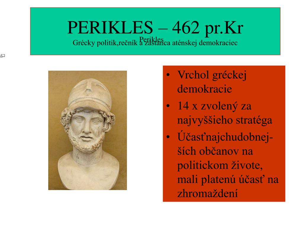 Perikles PERIKLES – 462 pr.Kr Grécky politik,rečník a zástanca aténskej demokraciec • Vrchol gréckej demokracie • 14 x zvolený za najvyššieho stratéga • Účasťnajchudobnej-ších občanov na politickom živote, mali platenú účasť na zhromaždení