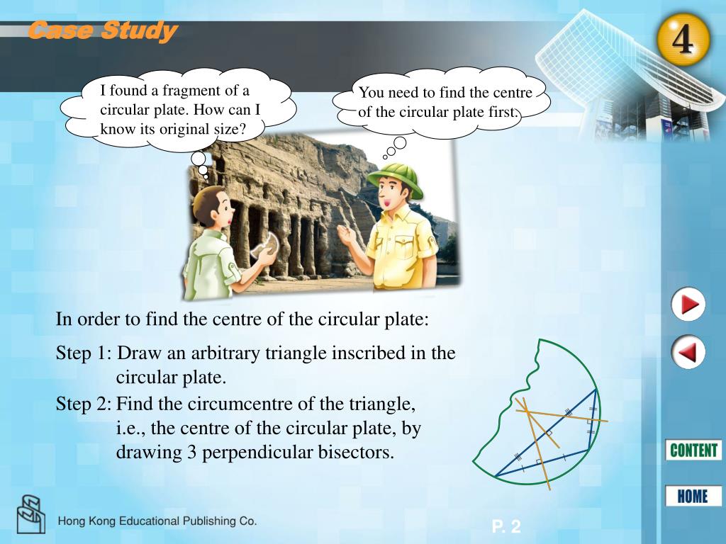 I found a fragment of a circular plate. How can I know its original size? You need to find the centre of the circular plate first. Case Study In order to find the centre of the circular plate: Step 1: Draw an arbitrary triangle inscribed in the circular plate. Step 2: Find the circumcentre of the triangle, i.e., the centre of the circular plate, by drawing 3 perpendicular bisectors.