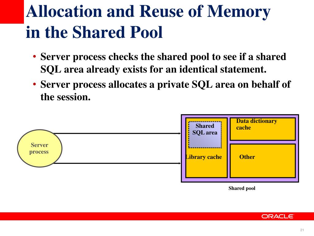 Allocation and Reuse of Memory in the Shared Pool • Server process checks the shared pool to see if a shared SQL area already exists for an identical statement. • Server process allocates a private SQL area on behalf of the session. Data dictionary cache Shared SQL area Serverprocess Library cache Other Shared pool
