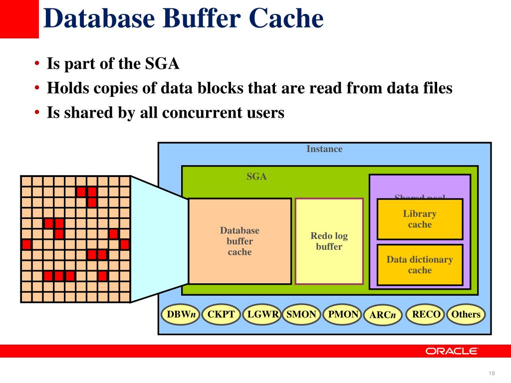 Database Buffer Cache • Is part of the SGA • Holds copies of data blocks that are read from data files • Is shared by all concurrent users Instance SGA Shared pool Databasebuffercache Redo logbuffer Library cache Data dictionarycache DBWn CKPT LGWR SMON PMON RECO Others ARCn
