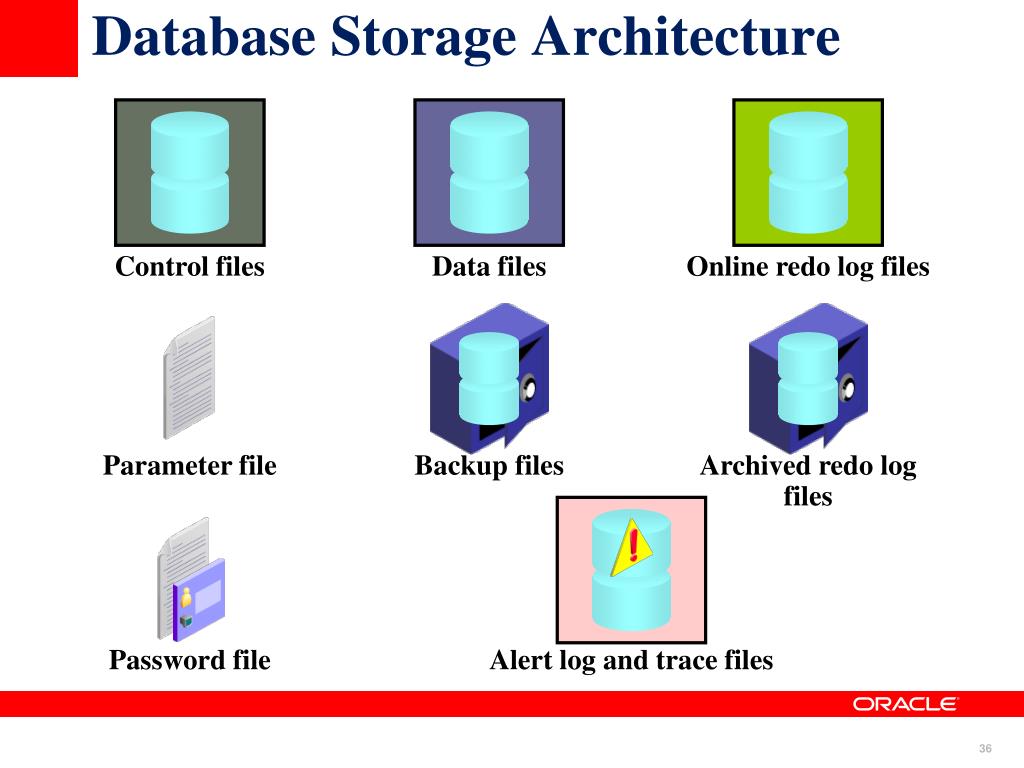 Database Storage Architecture Control files Data files Online redo log files Parameter file Backup files Archived redo log files Password file Alert log and trace files