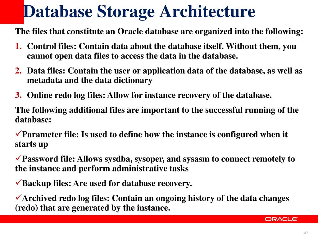Database Storage Architecture • The files that constitute an Oracle database are organized into the following: • Control files: Contain data about the database itself. Without them, you cannot open data files to access the data in the database. • Data files: Contain the user or application data of the database, as well as metadata and the data dictionary • Online redo log files: Allow for instance recovery of the database. • The following additional files are important to the successful running of the database: • Parameter file: Is used to define how the instance is configured when it starts up • Password file: Allows sysdba, sysoper, and sysasm to connect remotely to the instance and perform administrative tasks • Backup files: Are used for database recovery. • Archived redo log files: Contain an ongoing history of the data changes (redo) that are generated by the instance.