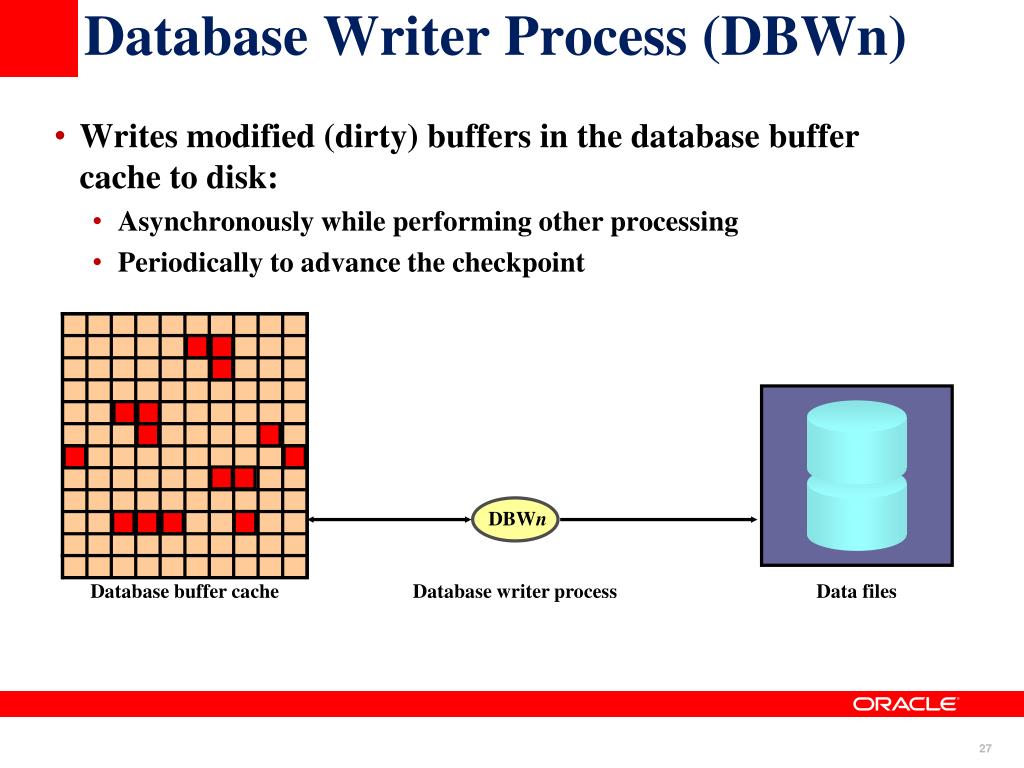Database Writer Process (DBWn) • Writes modified (dirty) buffers in the database buffer cache to disk: • Asynchronously while performing other processing • Periodically to advance the checkpoint DBWn Database buffer cache Database writer process Data files