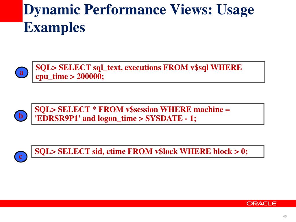 Dynamic Performance Views: Usage Examples SQL> SELECT sql_text, executions FROM v$sql WHERE cpu_time > 200000; a SQL> SELECT * FROM v$session WHERE machine = 'EDRSR9P1' and logon_time > SYSDATE - 1; b SQL> SELECT sid, ctime FROM v$lock WHERE block > 0; c