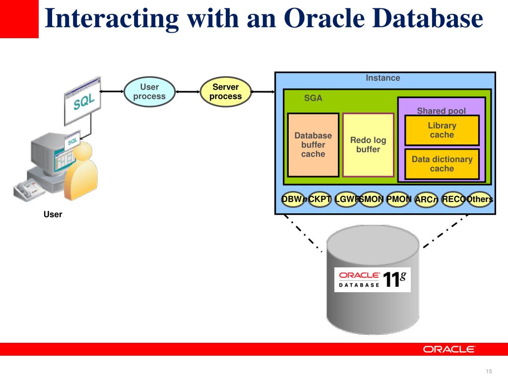 Interacting with an Oracle Database Instance Userprocess Serverprocess SGA Shared pool Databasebuffercache Redo logbuffer Library cache Data dictionarycache DBWn CKPT LGWR SMON PMON RECO Others ARCn User