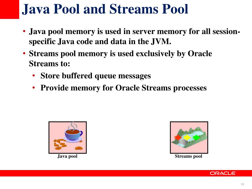 Java Pool and Streams Pool • Java pool memory is used in server memory for all session-specific Java code and data in the JVM. • Streams pool memory is used exclusively by Oracle Streams to: • Store buffered queue messages • Provide memory for Oracle Streams processes Java pool Streams pool