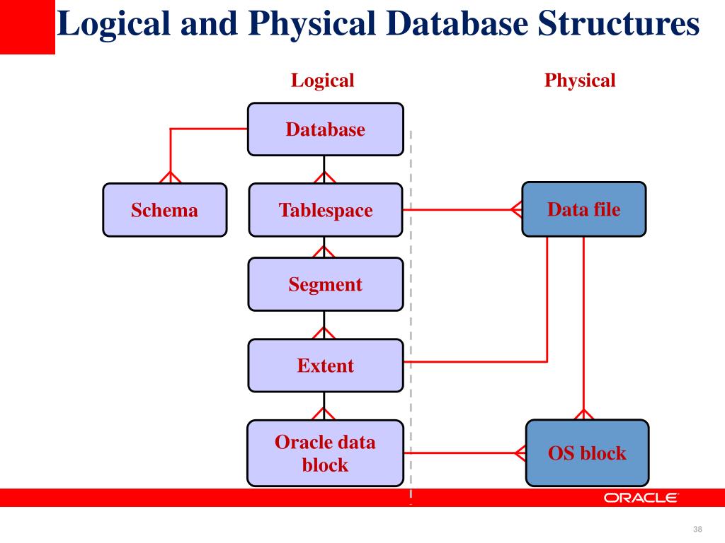 Logical and Physical Database Structures Logical Physical Database Data file Schema Tablespace Segment Extent OS block Oracle datablock