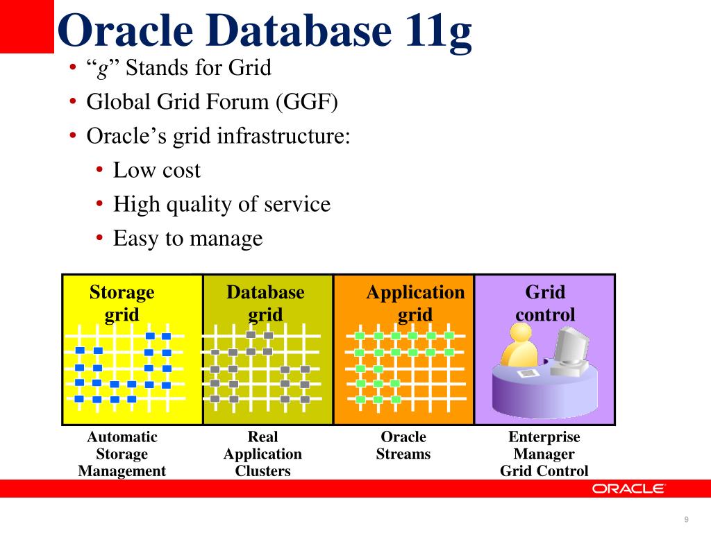 Storagegrid Databasegrid Applicationgrid Gridcontrol Automatic Storage Management Real Application Clusters Oracle Streams Enterprise ManagerGrid Control Oracle Database 11g • “g” Stands for Grid • Global Grid Forum (GGF) • Oracle’s grid infrastructure: • Low cost • High quality of service • Easy to manage