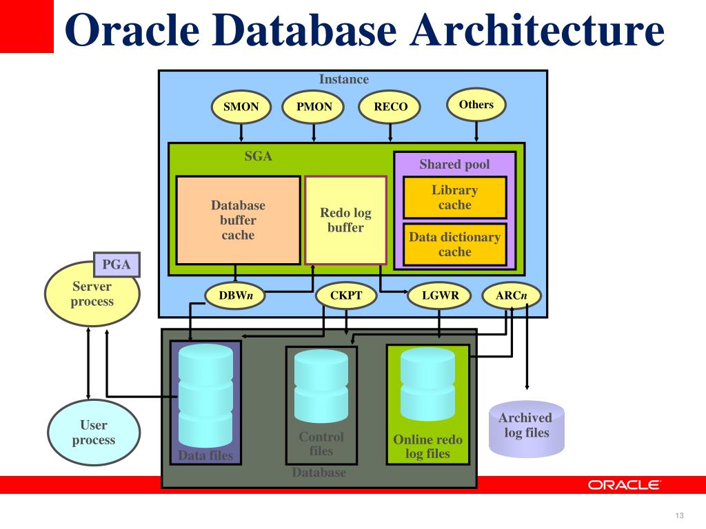 Oracle Database Architecture Instance Others SMON PMON RECO SGA Shared pool Databasebuffercache Redo logbuffer Library cache Data dictionarycache PGA Serverprocess DBWn CKPT LGWR ARCn Database Userprocess Archived log files Control files Online redo log files Data files