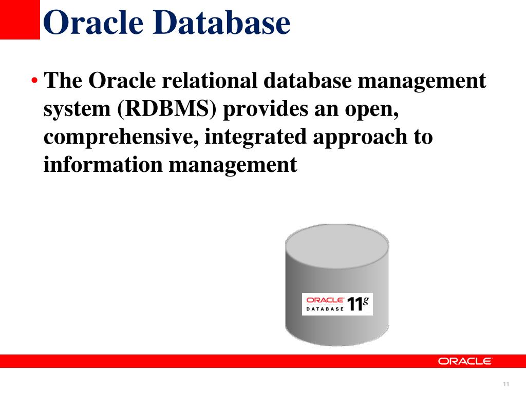 Oracle Database • The Oracle relational database management system (RDBMS) provides an open, comprehensive, integrated approach to information management