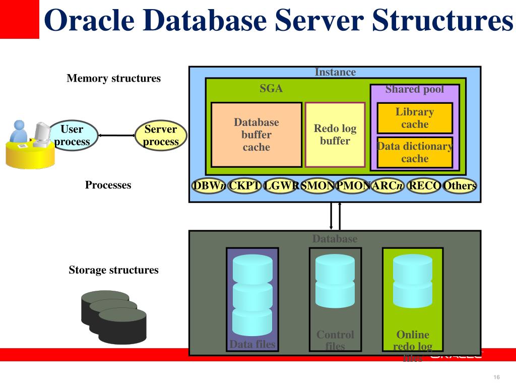 Userprocess Serverprocess Oracle Database Server Structures Instance Memory structures SGA Shared pool Databasebuffercache Redo logbuffer Library cache Data dictionarycache Processes DBWn CKPT LGWR SMON PMON ARCn RECO Others Database Storage structures Control files Online redo log files Data files