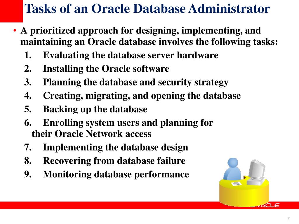 Tasks of an Oracle Database Administrator • A prioritized approach for designing, implementing, and maintaining an Oracle database involves the following tasks: 1. Evaluating the database server hardware 2. Installing the Oracle software 3. Planning the database and security strategy 4. Creating, migrating, and opening the database 5. Backing up the database 6. Enrolling system users and planning for their Oracle Network access 7. Implementing the database design 8. Recovering from database failure 9. Monitoring database performance