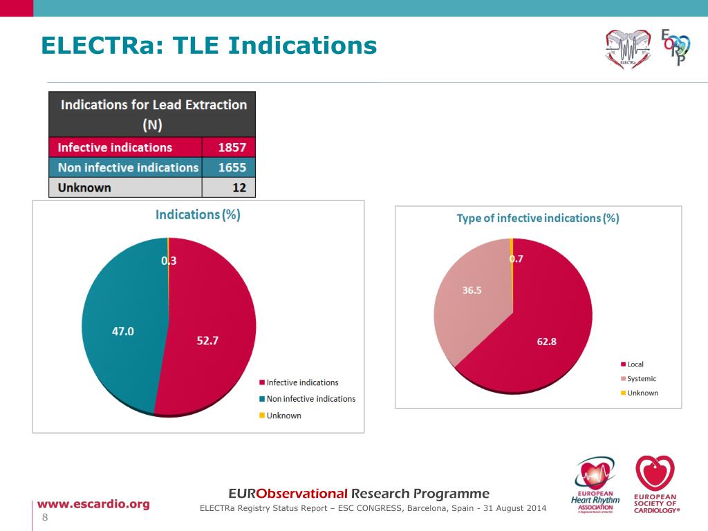 Conclusions ELECTRA Registry is the first large prospectic registry on Transvenous Lead Extraction conducted in the ESC countries Infective and non infective indications are almost equally considered in clinical practice for this kind of intervention The radiological success rate is more than 95% and the assumed clinical success rate is extremely high (98,3%) Major and Minor complications are more frequent in low volume centers and mainly in the post-operative period An accurate analysis of all data collected will give us details about the real world on TLE and will make possible a better knowledge to further improve the outcomes