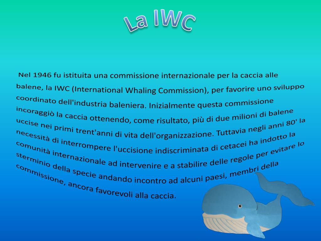 La IWC Nel 1946 fu istituita una commissione internazionale per la caccia alle balene, la IWC (International WhalingCommission), per favorire uno sviluppo coordinato dell'industria baleniera. Inizialmente questa commissione incoraggiò la caccia ottenendo, come risultato, più di due milioni di balene uccise nei primi trent'anni di vita dell'organizzazione. Tuttavia negli anni 80' la necessità di interrompere l'uccisione indiscriminata di cetacei ha indotto la comunità internazionale ad intervenire e a stabilire delle regole per evitare lo sterminio della specie andando incontro ad alcuni paesi, membri della commissione, ancora favorevoli alla caccia.