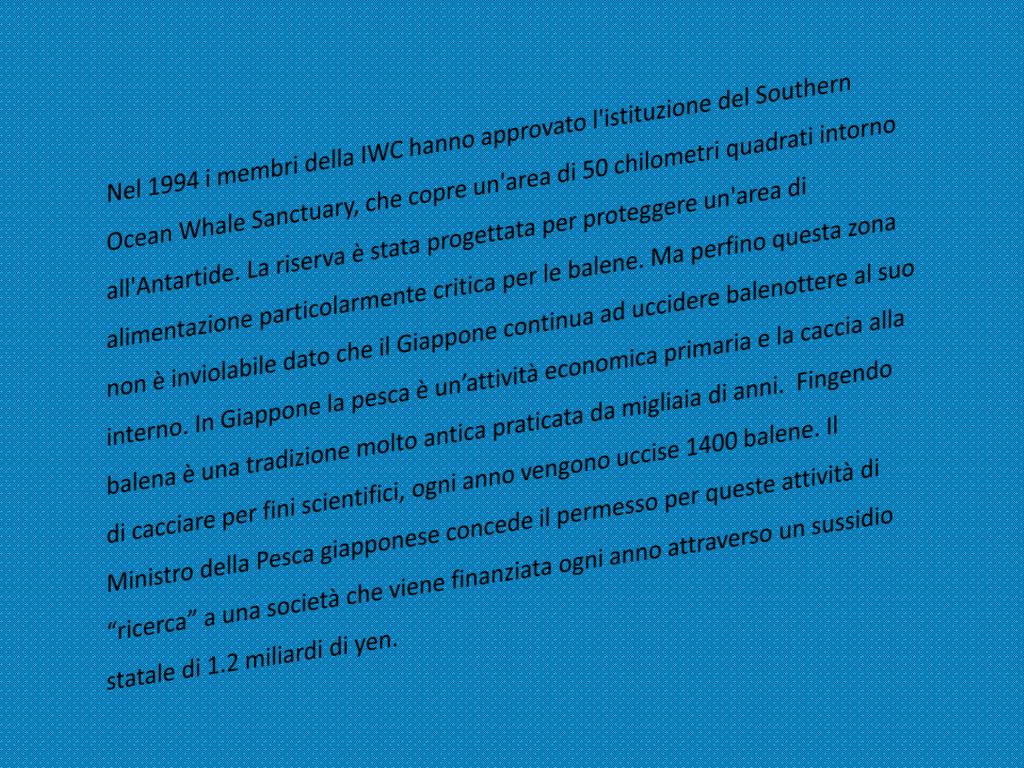 Nel 1994 i membri della IWC hanno approvato l'istituzione del Southern Ocean WhaleSanctuary, che copre un'area di 50 chilometri quadrati intorno all'Antartide. La riserva è stata progettata per proteggere un'area di alimentazione particolarmente critica per le balene. Ma perfino questa zona non è inviolabile dato che il Giappone continua ad uccidere balenottere al suo interno. In Giappone la pesca è un’attività economica primaria e la caccia alla balena è una tradizione molto antica praticata da migliaia di anni. Fingendo di cacciare per fini scientifici, ogni anno vengono uccise 1400 balene. Il Ministro della Pesca giapponese concede il permesso per queste attività di “ricerca” a una società che viene finanziata ogni anno attraverso un sussidio statale di 1.2 miliardi di yen.