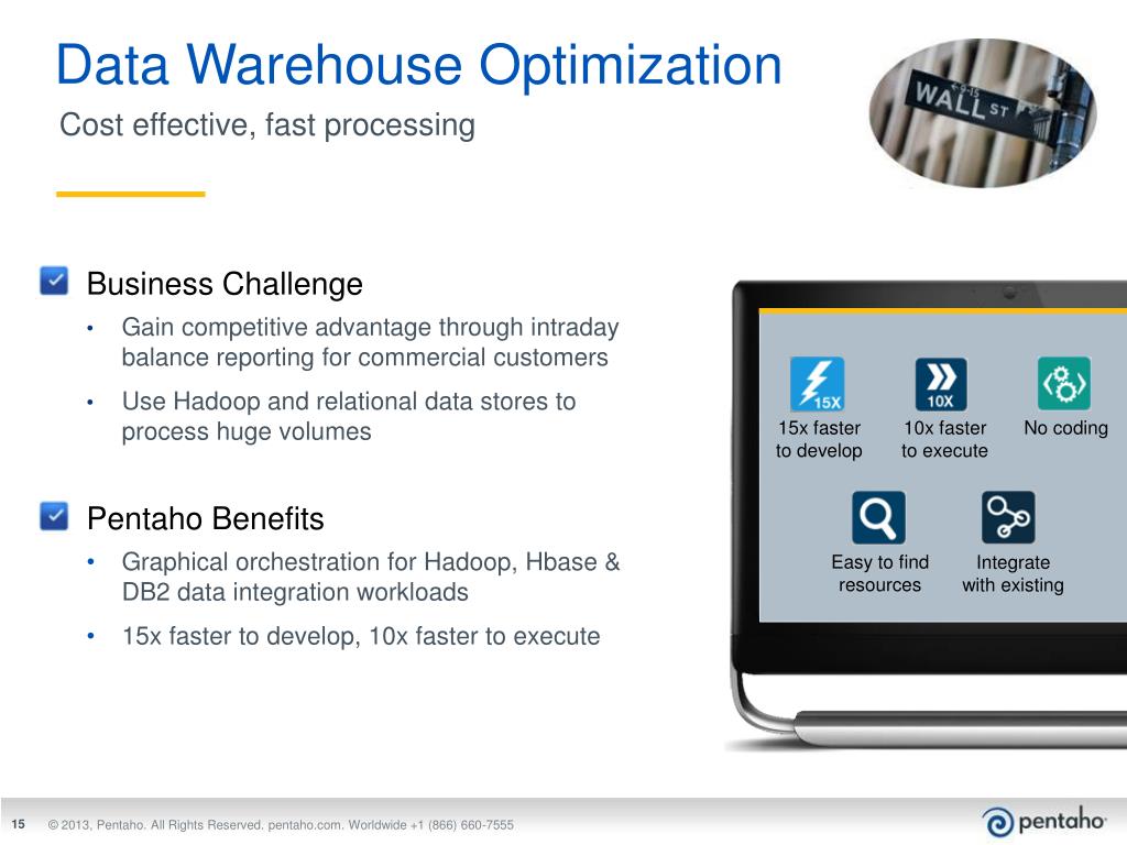 Business Challenge • Gain competitive advantage through intraday balance reporting for commercial customers • Use Hadoop and relational data stores to process huge volumes Data Warehouse Optimization Cost effective, fast processing 15x faster to develop 10x faster to execute No coding Easy to find resources Integrate with existing • Pentaho Benefits • Graphical orchestration for Hadoop, Hbase & DB2 data integration workloads • 15x faster to develop, 10x faster to execute