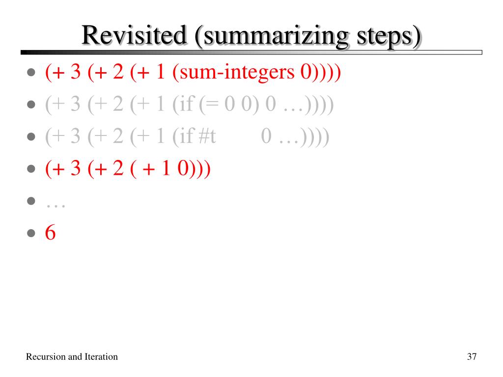 Revisited (summarizing steps) • Evaluate: (sum-integers 3) • (if (= 3 0) 0 (+ 3 (sum-integers (- 3 1)))) • (if #f 0 (+ 3 (sum-integers (- 3 1)))) • (+ 3 (sum-integers (- 3 1))) • (+ 3 (sum-integers 2)) • (+ 3 (if (= 2 0) 0 (+ 2 (sum-integers (- 2 1))))) • (+ 3 (+ 2 (sum-integers 1))) • (+ 3 (+ 2 (if (= 1 0) 0 (+ 1 (sum-integer (- 1 1)))))) Recursion and Iteration