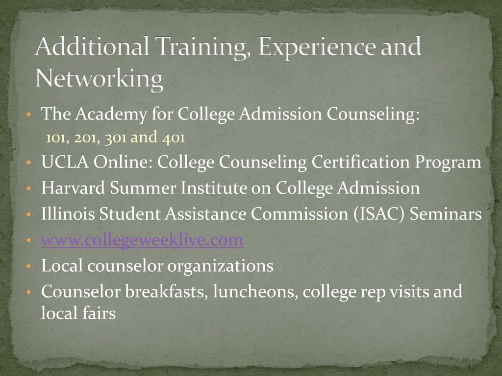 Additional Training, Experience and Networking • The Academy for College Admission Counseling: 101, 201, 301 and 401 • UCLA Online: College Counseling Certification Program • Harvard Summer Institute on College Admission • Illinois Student Assistance Commission (ISAC) Seminars • www.collegeweeklive.com • Local counselor organizations • Counselor breakfasts, luncheons, college rep visits and local fairs