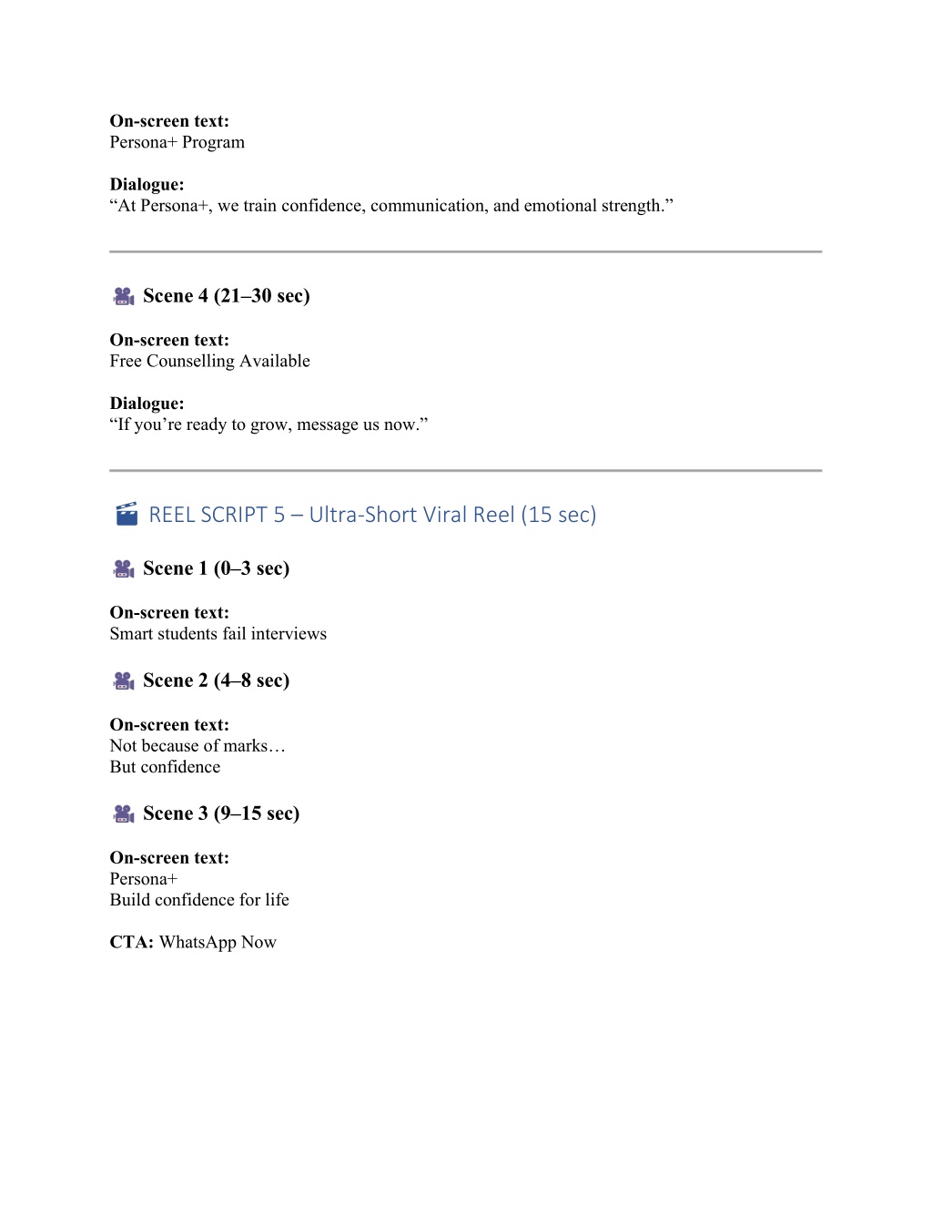 On-screen text: Persona+ Program Dialogue: “At Persona+, we train confidence, communication, and emotional strength.” ? ? ? ? ? ? ? ? ? ? Scene 4 (21–30 sec) On-screen text: Free Counselling Available Dialogue: “If you’re ready to grow, message us now.” ? REEL SCRIPT 5 – Ultra-Short Viral Reel (15 sec) ? ? ? ? ? ? ? ? ? ? Scene 1 (0–3 sec) On-screen text: Smart students fail interviews ? ? ? ? ? ? ? ? ? ? Scene 2 (4–8 sec) On-screen text: Not because of marks… But confidence ? ? ? ? ? ? ? ? ? ? Scene 3 (9–15 sec) On-screen text: Persona+ Build confidence for life CTA: WhatsApp Now