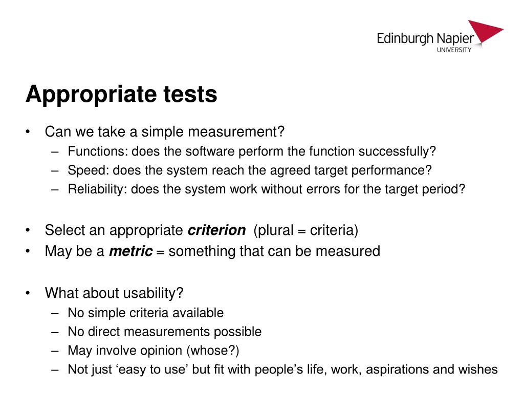 Appropriate tests • Can we take a simple measurement? • Functions: does the software perform the function successfully? • Speed: does the system reach the agreed target performance? • Reliability: does the system work without errors for the target period? • Select an appropriate criterion (plural = criteria) • May be a metric = something that can be measured • What about usability? • No simple criteria available • No direct measurements possible • May involve opinion (whose?) • Not just ‘easy to use’ but fit with people’s life, work, aspirations and wishes