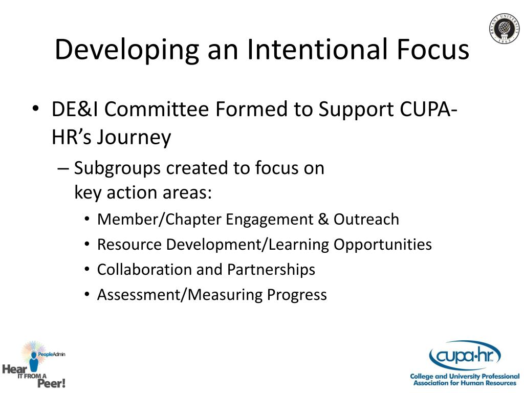 Developing an Intentional Focus • DE&I Committee Formed to Support CUPA-HR’s Journey • Subgroups created to focus on key action areas: • Member/Chapter Engagement & Outreach • Resource Development/Learning Opportunities • Collaboration and Partnerships • Assessment/Measuring Progress