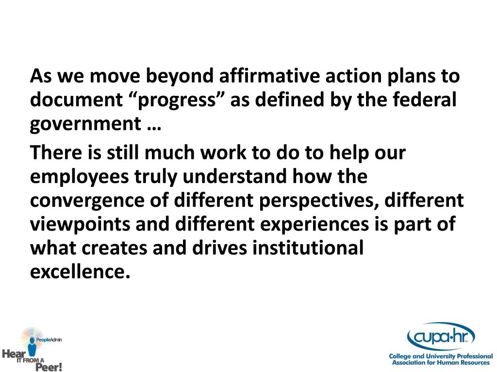 As we move beyond affirmative action plans to document “progress” as defined by the federal government … There is still much work to do to help our employees truly understand how the convergence of different perspectives, different viewpoints and different experiences is part of what creates and drives institutional excellence.