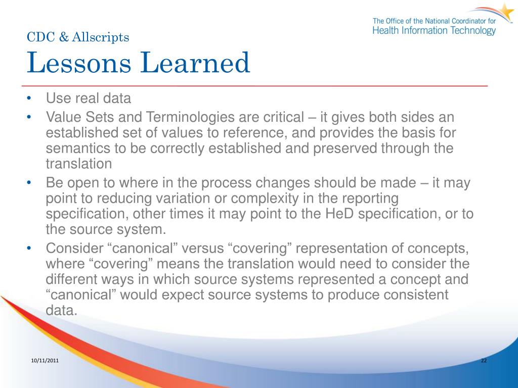 CDC & AllscriptsLessons Learned • Use real data • Value Sets and Terminologies are critical – it gives both sides an established set of values to reference, and provides the basis for semantics to be correctly established and preserved through the translation • Be open to where in the process changes should be made – it may point to reducing variation or complexity in the reporting specification, other times it may point to the HeD specification, or to the source system. • Consider “canonical” versus “covering” representation of concepts, where “covering” means the translation would need to consider the different ways in which source systems represented a concept and “canonical” would expect source systems to produce consistent data.