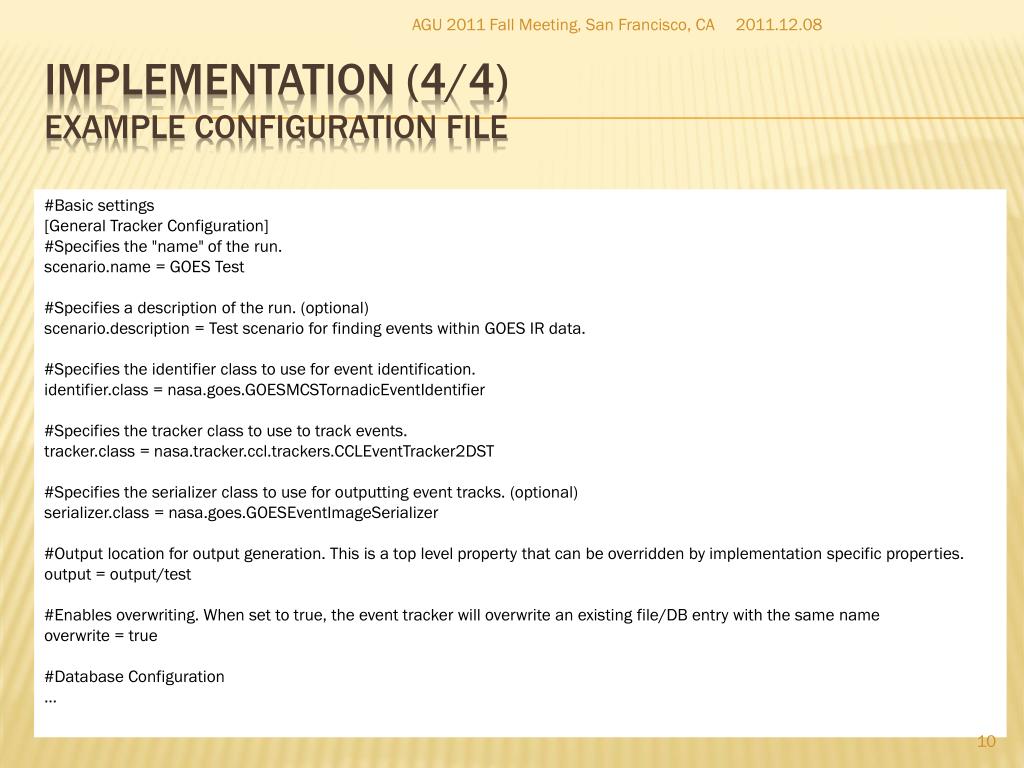 AGU 2011 Fall Meeting, San Francisco, CA Implementation (4/4)Example Configuration File #Basic settings [General Tracker Configuration] #Specifies the "name" of the run. scenario.name = GOES Test #Specifies a description of the run. (optional) scenario.description = Test scenario for finding events within GOES IR data. #Specifies the identifier class to use for event identification. identifier.class = nasa.goes.GOESMCSTornadicEventIdentifier #Specifies the tracker class to use to track events. tracker.class = nasa.tracker.ccl.trackers.CCLEventTracker2DST #Specifies the serializer class to use for outputting event tracks. (optional) serializer.class = nasa.goes.GOESEventImageSerializer #Output location for output generation. This is a top level property that can be overridden by implementation specific properties. output = output/test #Enables overwriting. When set to true, the event tracker will overwrite an existing file/DB entry with the same nameoverwrite = true#Database Configuration …