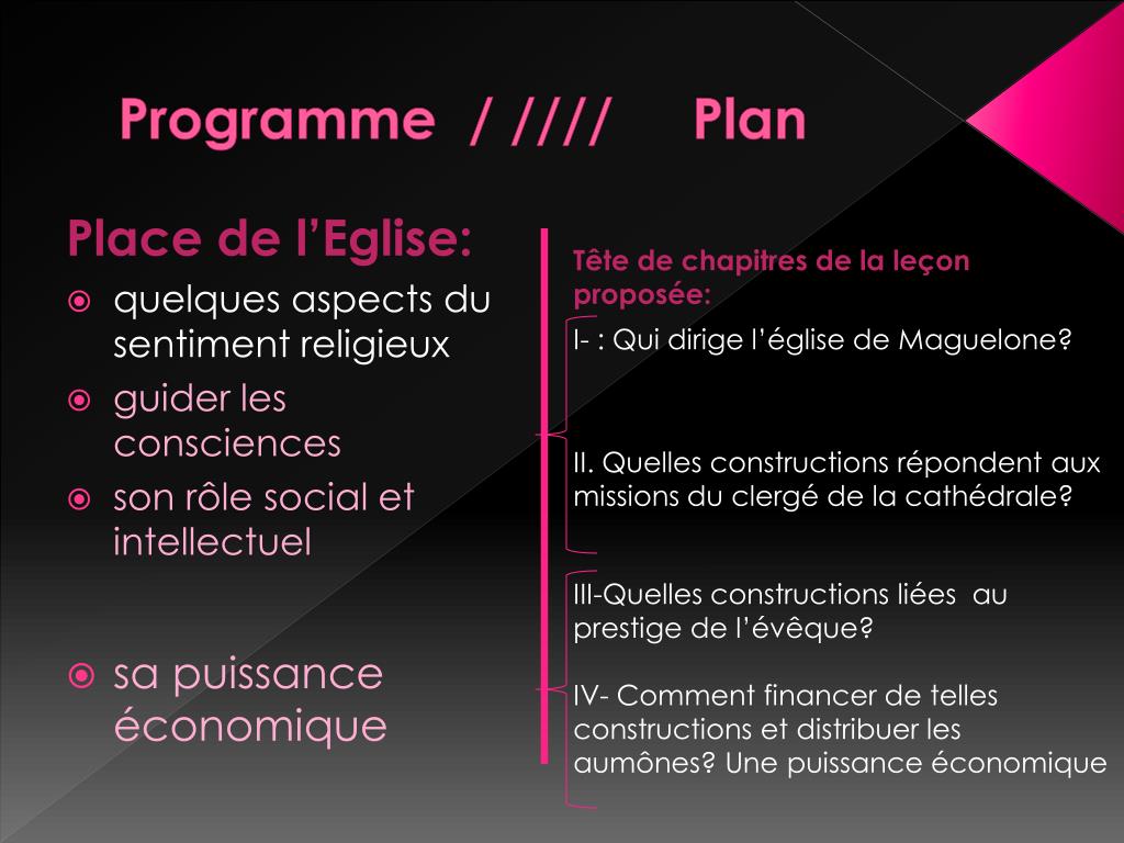 Programme / //// Plan Place de l’Eglise: quelques aspects du sentiment religieux guider les consciences son rôle social et intellectuel sa puissance économique Tête de chapitres de la leçon proposée: I- : Qui dirige l’église de Maguelone? II. Quelles constructions répondent aux missions du clergé de la cathédrale? III-Quelles constructions liées au prestige de l’évêque? IV- Comment financer de telles constructions et distribuer les aumônes? Une puissance économique