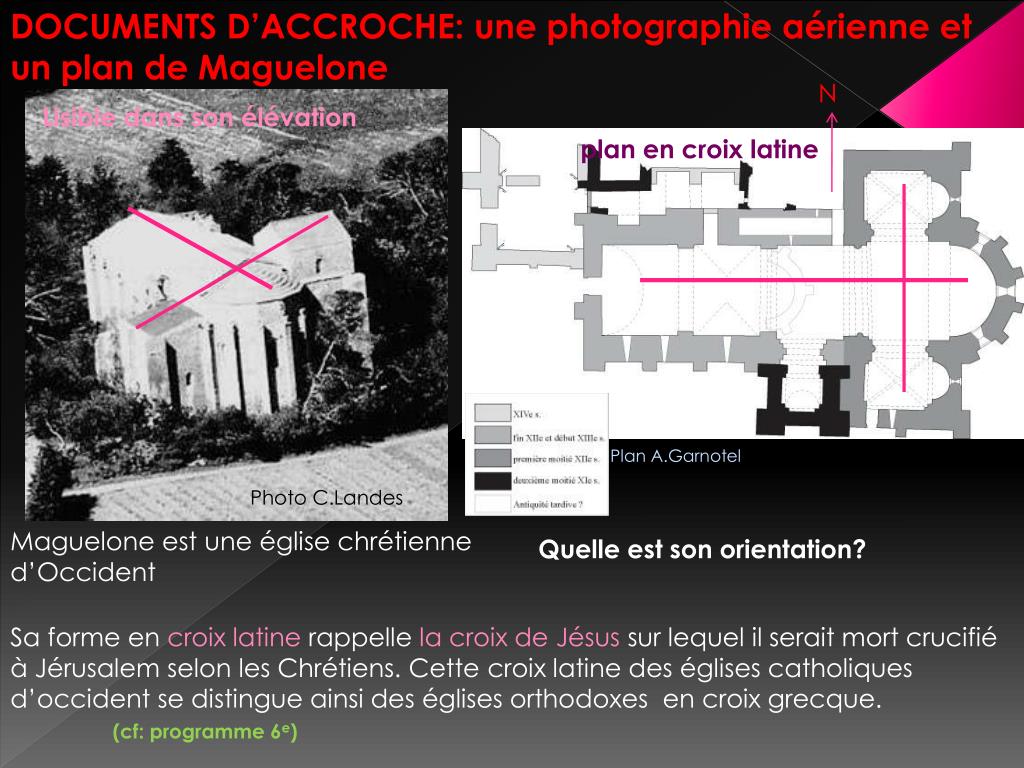 DOCUMENTS D’ACCROCHE: une photographie aérienne et un plan de Maguelone N Lisible dans son élévation plan en croix latine Plan A.Garnotel Photo C.Landes Maguelone est une église chrétienne d’Occident Quelle est son orientation? Sa forme en croix latine rappelle la croix de Jésus sur lequel il serait mort crucifié à Jérusalem selon les Chrétiens. Cette croix latine des églises catholiques d’occident se distingue ainsi des églises orthodoxes en croix grecque. (cf: programme 6e)