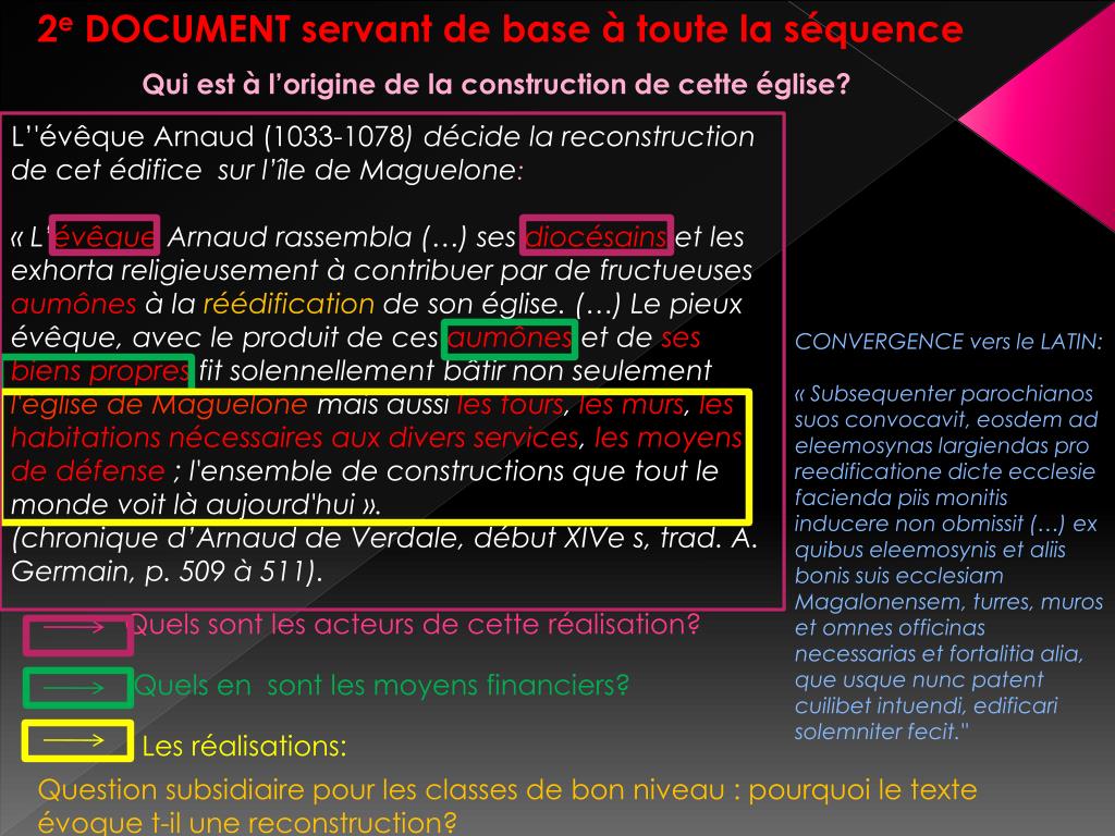 2e DOCUMENT servant de base à toute la séquence Qui est à l’origine de la construction de cette église? L’'évêque Arnaud (1033-1078) décide la reconstruction de cet édifice sur l’île de Maguelone: « L’évêque Arnaud rassembla (…) ses diocésains et les exhorta religieusement à contribuer par de fructueuses aumônes à la réédification de son église. (…) Le pieux évêque, avec le produit de ces aumônes et de ses biens propres fit solennellement bâtir non seulement l'église de Maguelone mais aussi les tours, les murs, les habitations nécessaires aux divers services, les moyens de défense ; l'ensemble de constructions que tout le monde voit là aujourd'hui ». (chronique d’Arnaud de Verdale, début XIVe s, trad. A. Germain, p. 509 à 511). CONVERGENCE vers le LATIN: « Subsequenterparochianossuosconvocavit, eosdem ad eleemosynaslargiendas pro reedificatione dicte ecclesiefaciendapiismonitisinducere non obmissit (…) ex quibuseleemosynis et aliis bonis suis ecclesiamMagalonensem, turres, muros et omnesofficinasnecessarias et fortalitia alia, que usque nunc patent cuilibetintuendi, edificarisolemniterfecit." Quels sont les acteurs de cette réalisation? Quels en sont les moyens financiers? Les réalisations: Question subsidiaire pour les classes de bon niveau : pourquoi le texte évoque t-il une reconstruction?