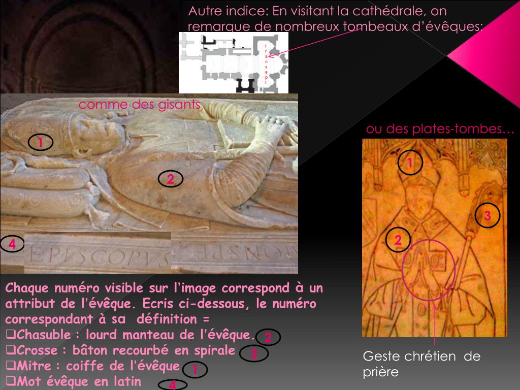 Autre indice: En visitant la cathédrale, on remarque de nombreux tombeaux d’évêques: transept comme des gisants 1 ou des plates-tombes… 1 1 2 2 3 4 2 4 • Chaque numéro visible sur l’image correspond à un attribut de l’évêque. Ecris ci-dessous, le numéro correspondant à sa définition = • Chasuble: lourd manteau de l’évêque. • Crosse: bâton recourbé en spirale • Mitre: coiffe de l’évêque • Mot évêque en latin 2 3 Geste chrétien de prière 1 4