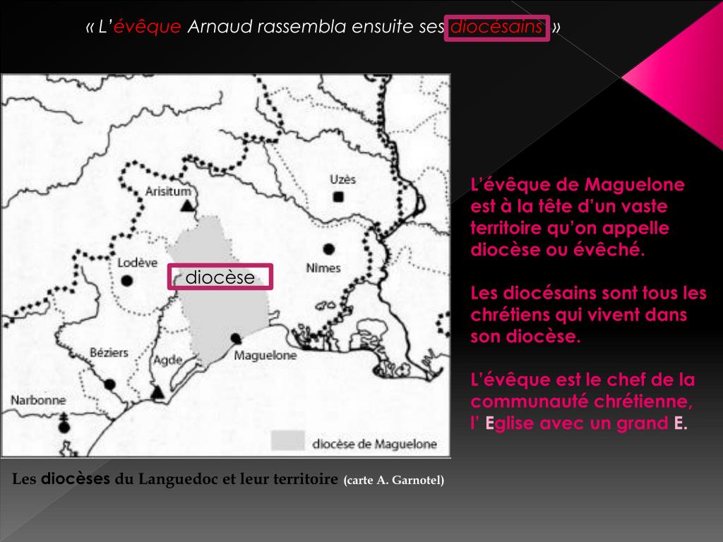 « L’évêque Arnaud rassembla ensuite ses diocésains » L’évêque de Maguelone est à la tête d’un vaste territoire qu’on appelle diocèse ou évêché. Les diocésains sont tous les chrétiens qui vivent dans son diocèse. L’évêque est le chef de la communauté chrétienne, l’ Eglise avec un grand E. diocèse Les diocèses du Languedoc et leur territoire(carte A. Garnotel)