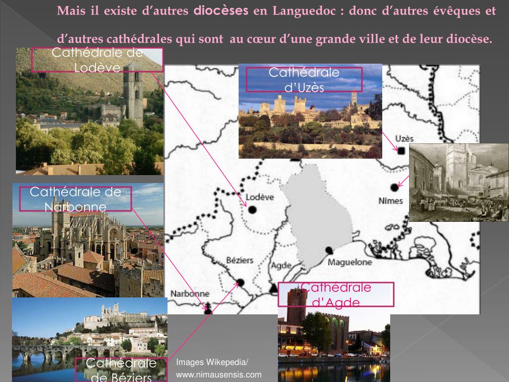 Mais il existe d’autres diocèses en Languedoc : donc d’autres évêques et d’autres cathédrales qui sont au cœur d’une grande ville et de leur diocèse. Cathédrale de Lodève Cathédrale d’Uzès Cathédrale de Narbonne Cathédrale d’Agde Images Wikepedia/ Cathédrale de Béziers www.nimausensis.com