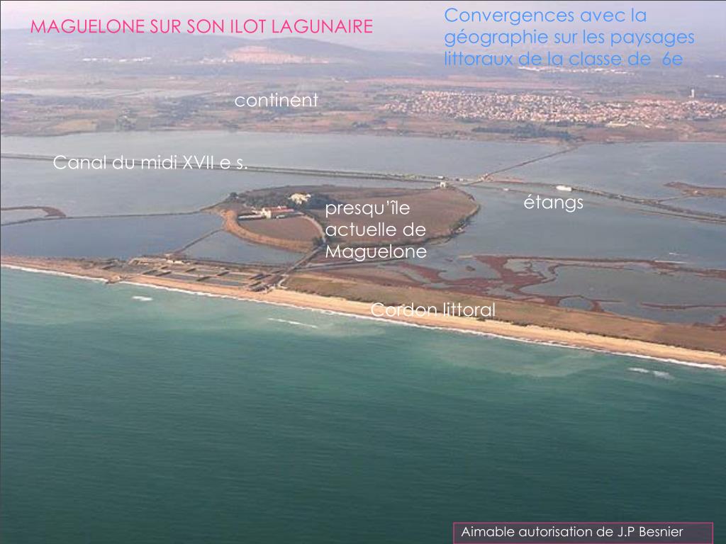 Convergences avec la géographie sur les paysages littoraux de la classe de 6e MAGUELONE SUR SON ILOT LAGUNAIRE continent Canal du midi XVII e s. étangs presqu’île actuelle de Maguelone Cordon littoral Aimable autorisation de J.P Besnier