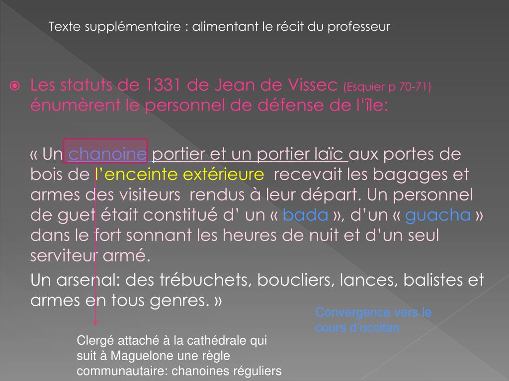 Texte supplémentaire : alimentant le récit du professeur • Les statuts de 1331 de Jean de Vissec(Esquier p 70-71) énumèrent le personnel de défense de l’île: « Un chanoine portier et un portier laïc aux portes de bois de l’enceinte extérieure recevait les bagages et armes des visiteurs rendus à leur départ. Un personnel de guet était constitué d’ un « bada », d’un « guacha » dans le fort sonnant les heures de nuit et d’un seul serviteur armé. Un arsenal: des trébuchets, boucliers, lances, balistes et armes en tous genres. » Convergence vers le cours d’occitan Clergé attaché à la cathédrale qui suit à Maguelone une règle communautaire: chanoines réguliers
