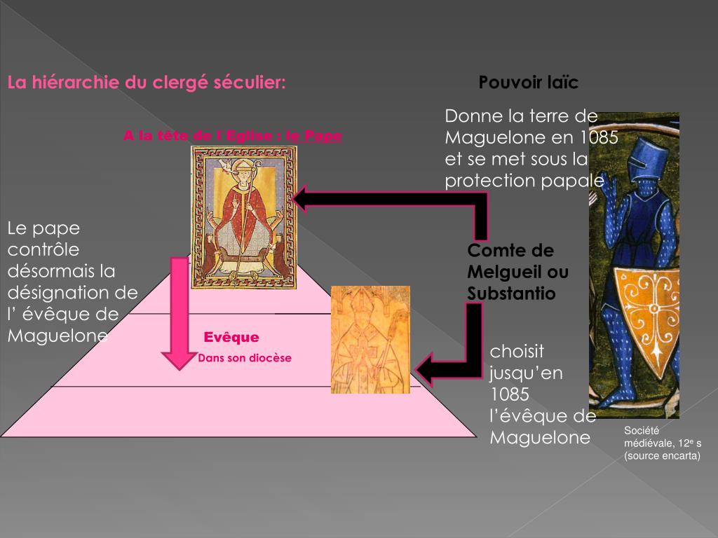 La hiérarchie du clergé séculier: Pouvoir laïc Donne la terre de Maguelone en 1085 et se met sous la protection papale A la tête de l’Eglise: le Pape Le pape contrôle désormais la désignation de l’ évêque de Maguelone Comte de Melgueil ou Substantio Evêque choisit jusqu’en 1085 l’évêque de Maguelone Dans son diocèse Société médiévale, 12e s (source encarta)