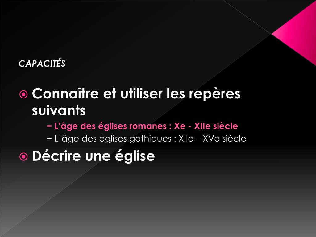 CAPACITÉS Connaître et utiliser les repères suivants − L’âge des églises romanes : Xe - XIIe siècle − L’âge des églises gothiques : XIIe – XVe siècle Décrire une église