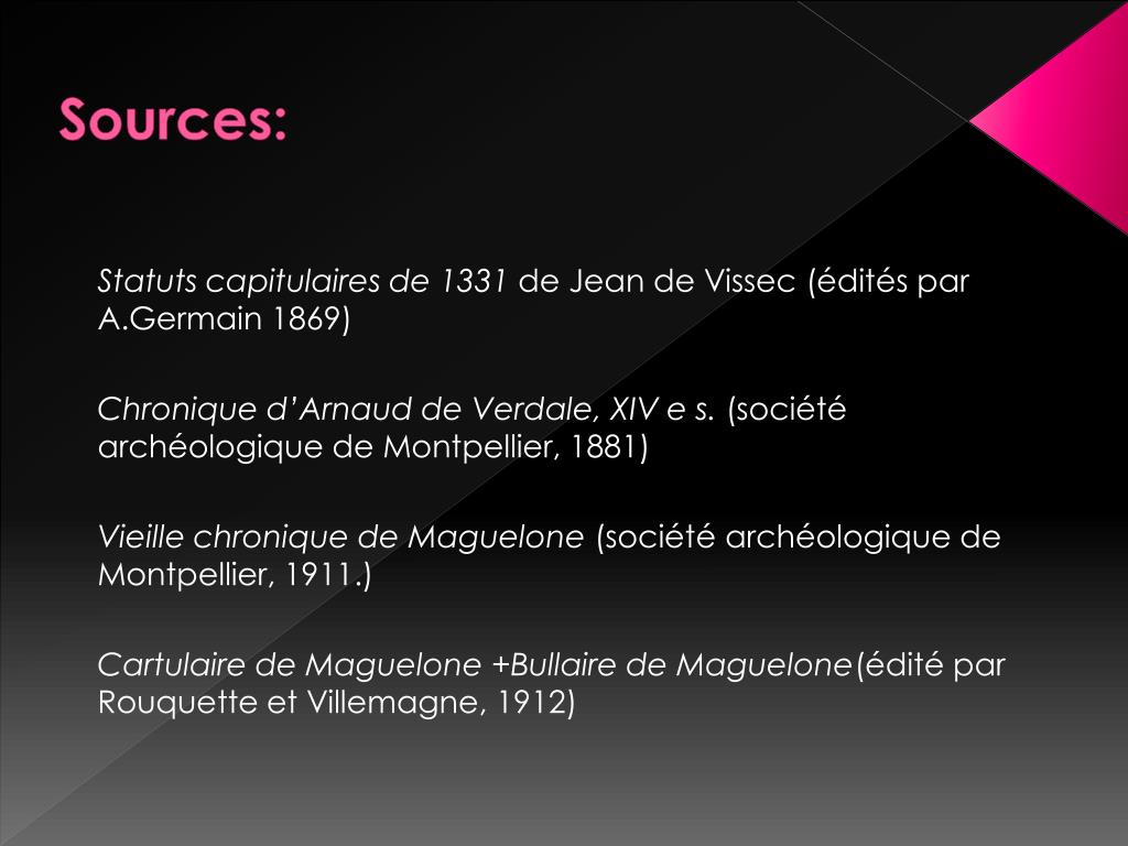 Sources: Statuts capitulaires de 1331 de Jean de Vissec (édités par A.Germain 1869) Chronique d’Arnaud de Verdale, XIV e s. (société archéologique de Montpellier, 1881) Vieille chronique de Maguelone (société archéologique de Montpellier, 1911.) Cartulaire de Maguelone +Bullaire de Maguelone(édité par Rouquette et Villemagne, 1912)